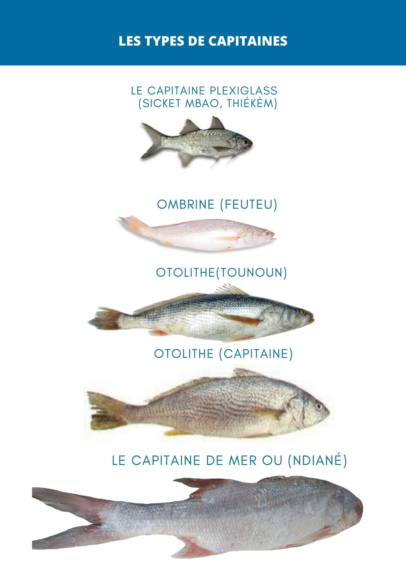 Le capitaine de mer ou (ndiané) en wolof, le capitaine plexiglas ou sicket ou thiékem, ombrine et l’otolithe Sénégalensis et otolithe ou capitaine.